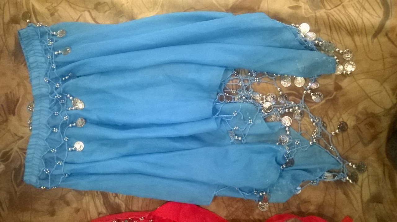 Ako druhá na rade je bledomodrá sukňa po kolená, hviezdicový strih, lemy sú zdobené taktiež striebornými peniažtekmi. Na bedrách ju drží pružná guma. Univerzálna veľkosť. Sukňa presvitá, preto je vhodné dať pod ňu ešte nejakú jednoduchú dlhú sukňu alebo turecké nohavice (pantalony). Taktiež takmer nenosená, cena je 4,50 eura.