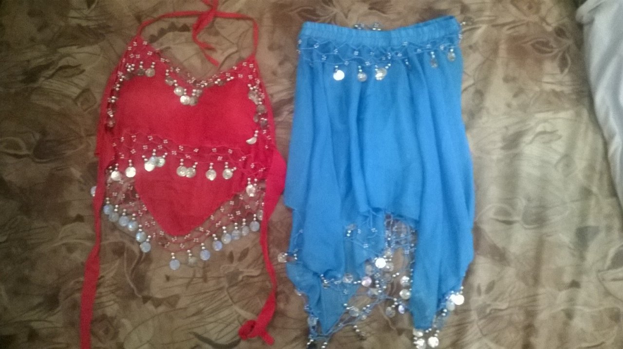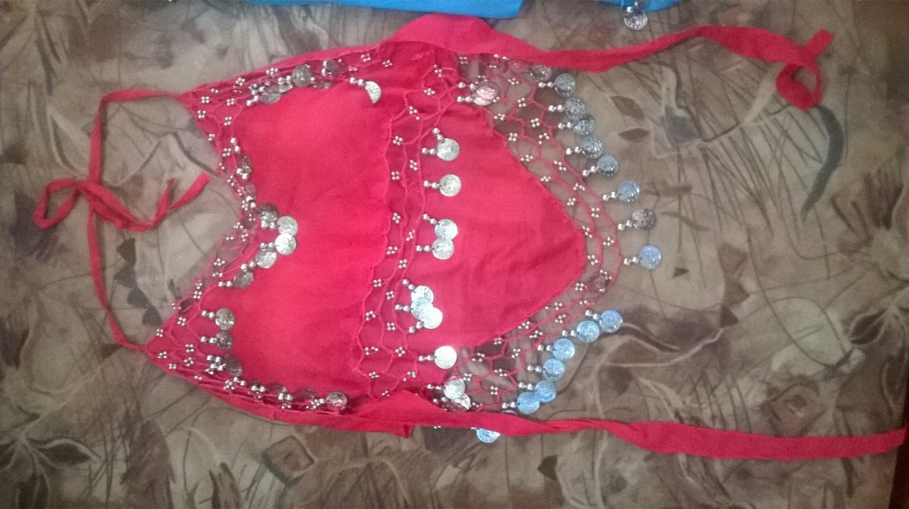 Červený top na orientálny tanec, farba bledobordová so striebornými peniažtekmi ako ozdoba - takmer nenosený. Skôr na drobnejšiu postavu, ale dá sa upraviť došívkami. Pripevňuje sa viazacími šnúrkami. Cena 3,50 eura.